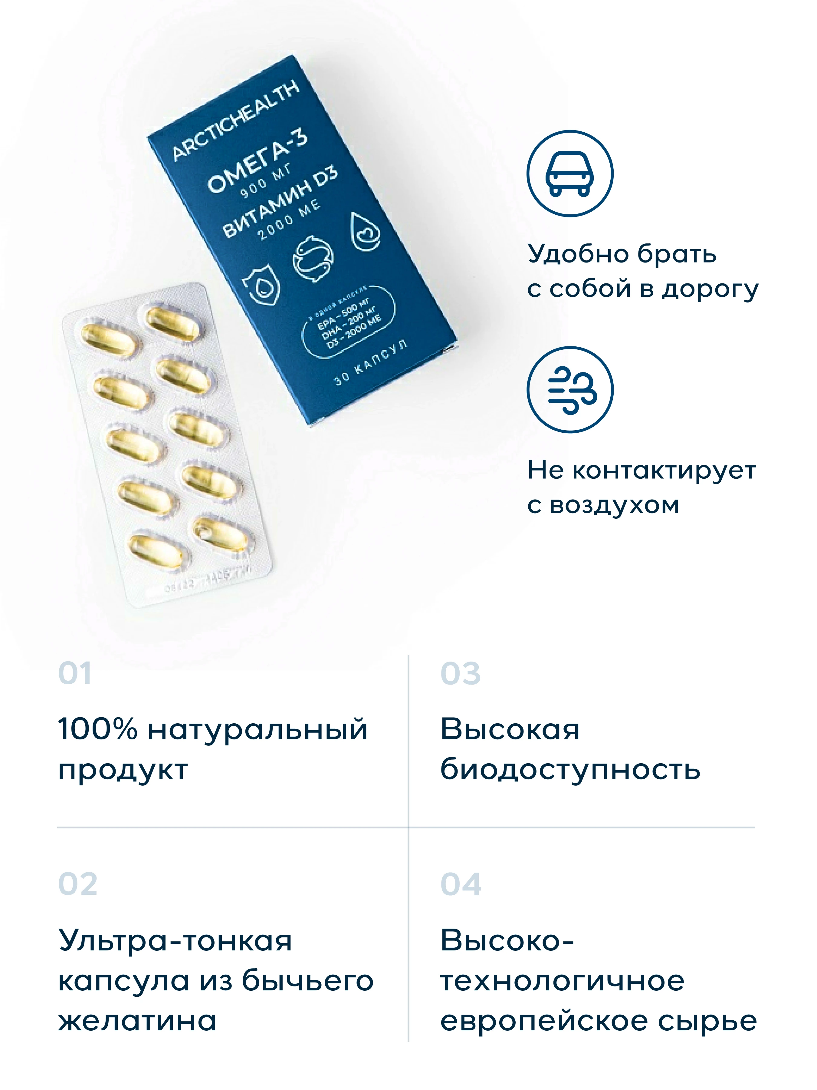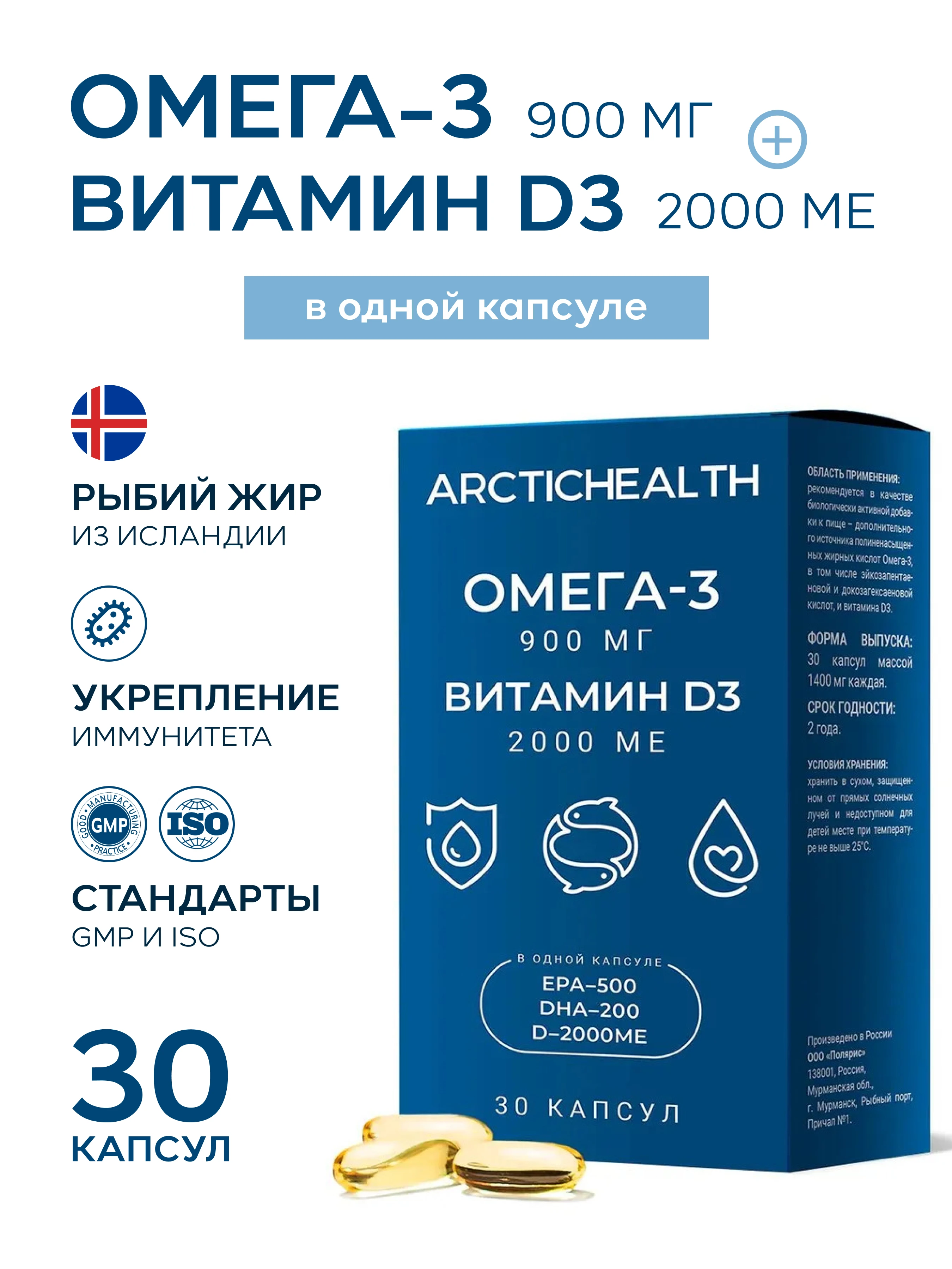 ARCTICHEALTH® «Омега-3 900 мг и витамин D 2000 МЕ» – натуральный биоактивный комплекс Омега-3 и витамина D на основе высокоочищенного рыбьего жира из Исландии с высокой концентрацией Омега-3 ПНЖК и витамина D в одной капсуле.