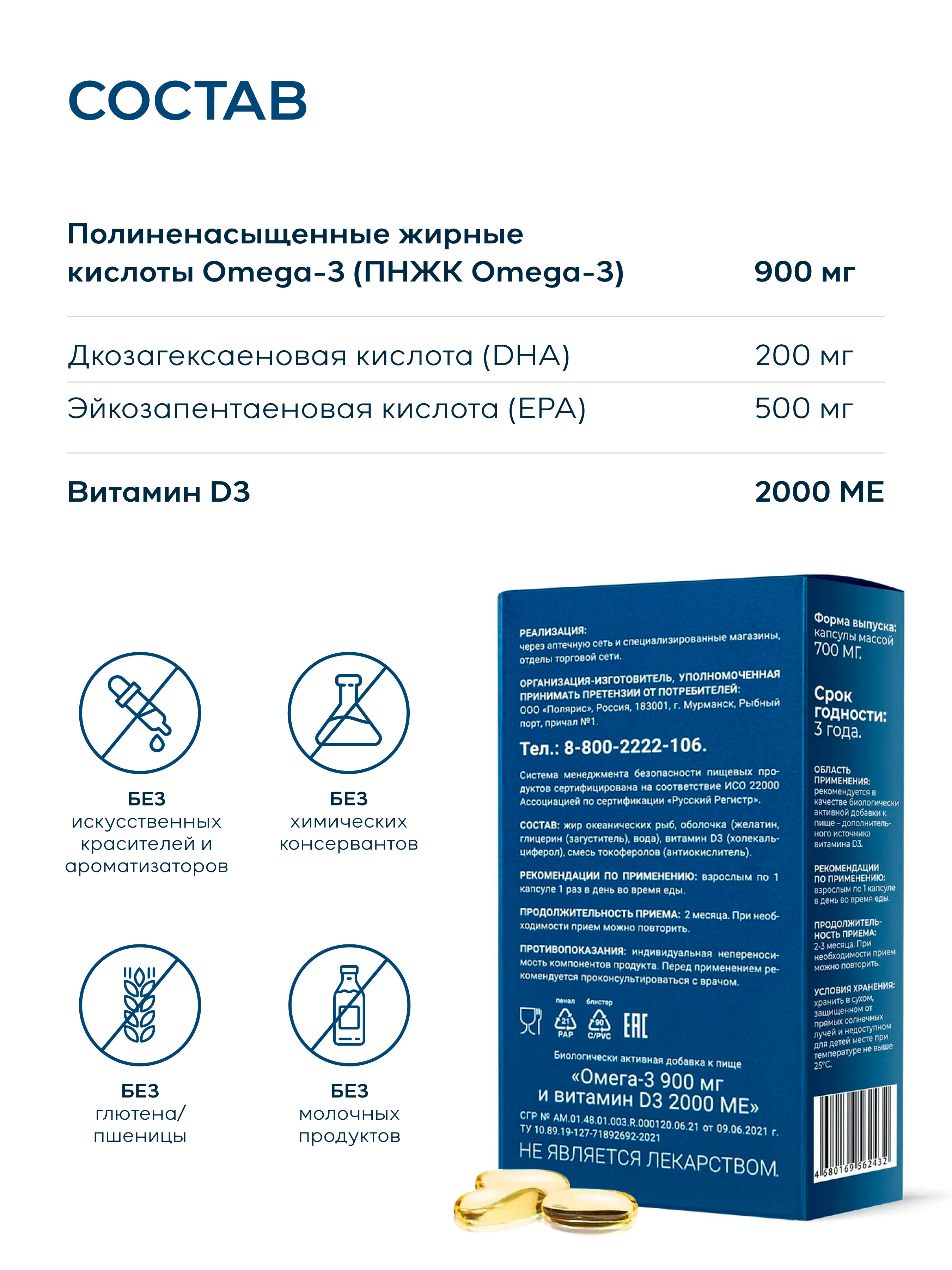 ARCTICHEALTH® «Омега-3 900 мг и витамин D 2000 МЕ» содержит очень важные компоненты: полиненасыщенные жирные кислоты - эйкозапентаеновую (ЭПК) и докозагексаеновую (ДГК) в высокой концентрации и суточную дозу витамина D на одну капсулу.